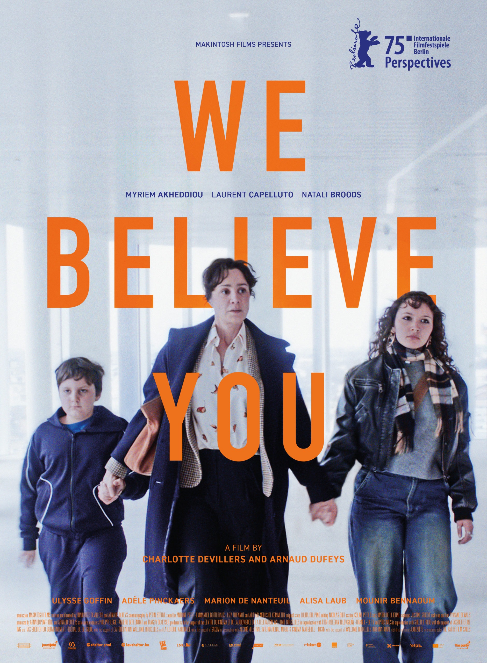Charlotte Devillers and Arnaud Dufeys, We Believe You / On vous croit (2025), from top: Myriem Akheddiou and Laurent Capelluto; Akheddiou, Adèle Pinckaers, and Ulysse Goffin; We Believe You poster; Capelluto, Natali Broods, and Akheddiou.