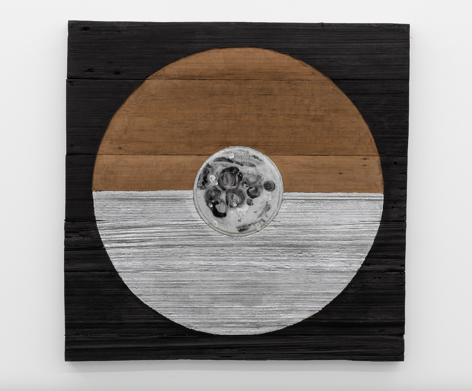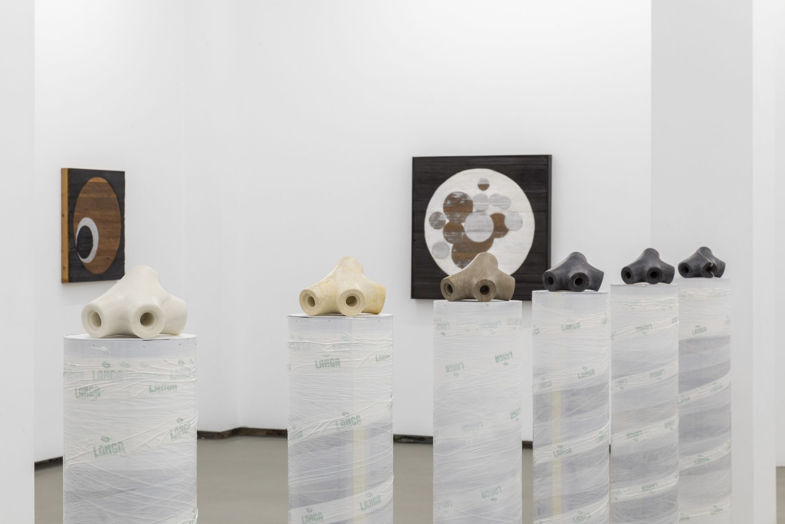 Oscar Tuazon, Moon Poem, Cibrián, Donostia–San Sebastián, Spain, November 21, 2025–February 7, 2026, from top: Know What You Do Before You Do What You Know, 2025, enamel on carved and charred western red cedar; (foreground, from left) Space Frame (Marfil Crema), 2025, Ivory Cream Marble, and Space Frame (Macael), 2025, Macael Marble, (background) Harvest Moon, 2025, acrylic and enamel on canvas; Moon Poem, 2025, enamel and acrylic on carved and charred western red cedar; exhibition view with, in background, Torn Moon, 2025, enamel and acrylic on carved and charred western red cedar; The Boat, 2025, enameled glass, enamel on carved and charred western red cedar; (from left) Space Frame (Marquina Negro) 3, 2025, Black Marquina Marble, Space Frame (Marquina Negro) 1, 2025, Black Marquina Marble, Space Frame (Marquina Negro) 2, 2025, Black Marquina Marble, Space Frame (Crema Levante), 2025, Levante Cream Marble, Space Frame (Marfil Crema), and Space Frame (Macael).